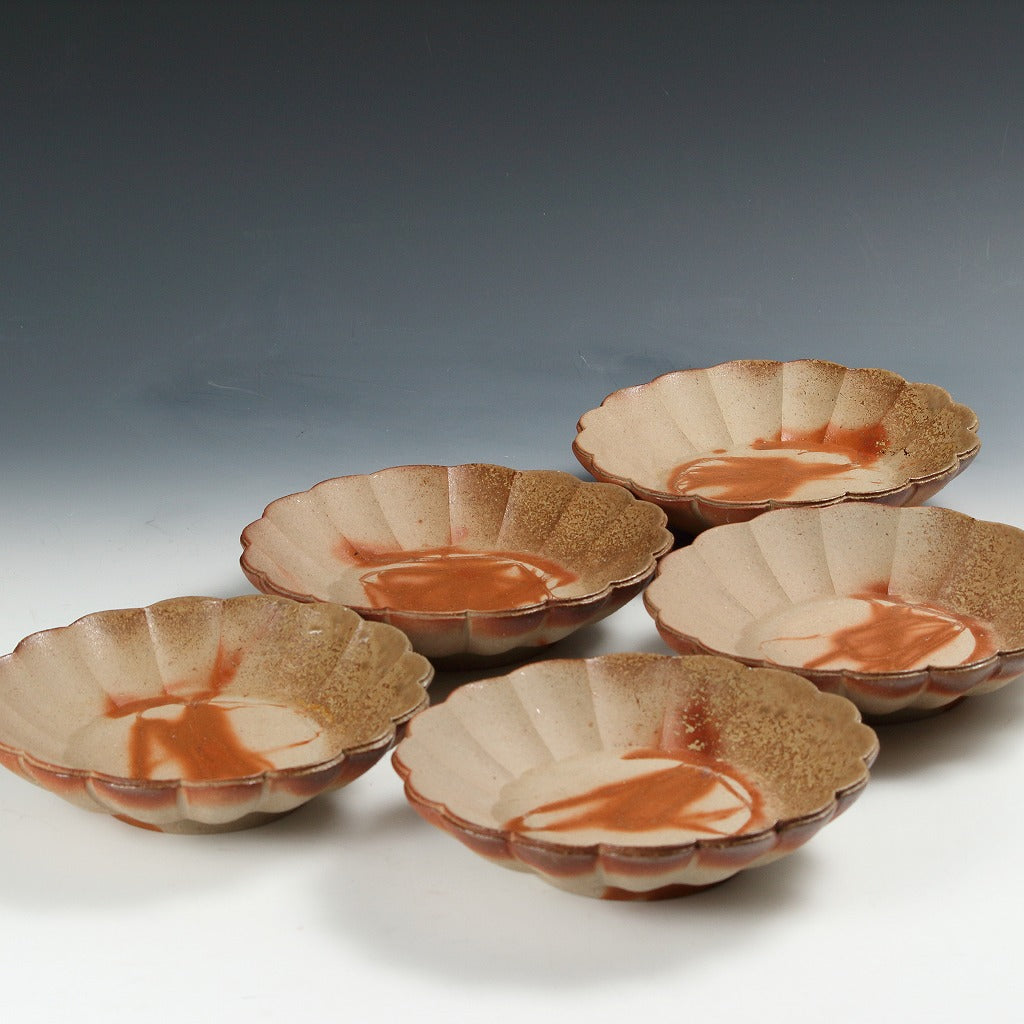名工 永末隆平|NAGASUE Ryuhei(岡山, 1951- ) 備前 輪花鉢 5客揃 共箱 dbsy15971-ミ